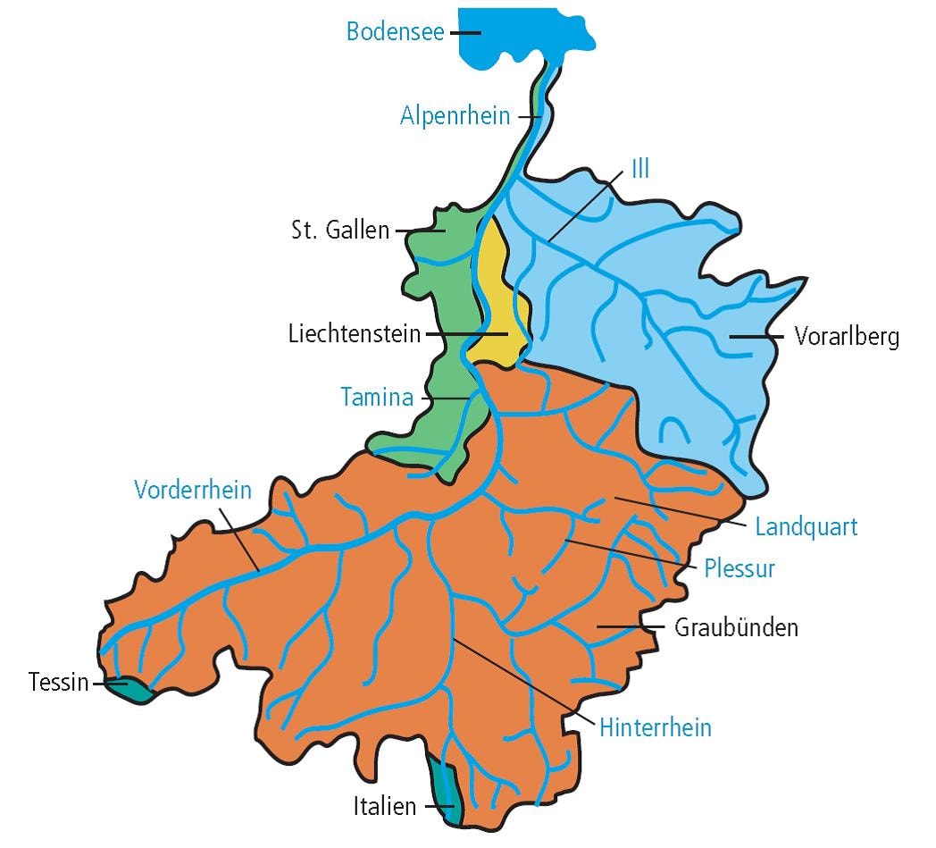 Die zwei Arme des Rheins in seinem Ursprungsgebiet, Vorder- und Hinterrhein, vereinigen sich bei Reichenau etwas südöstlich von Chur. Die Länge der Rheinstrecke von Chur bis zu seiner Mündung in den Bodensee beträgt 90 km. Das Einzugsgebiet des Rheins ist bei der Pegelstelle Diepoldsau 6119 km² gross.